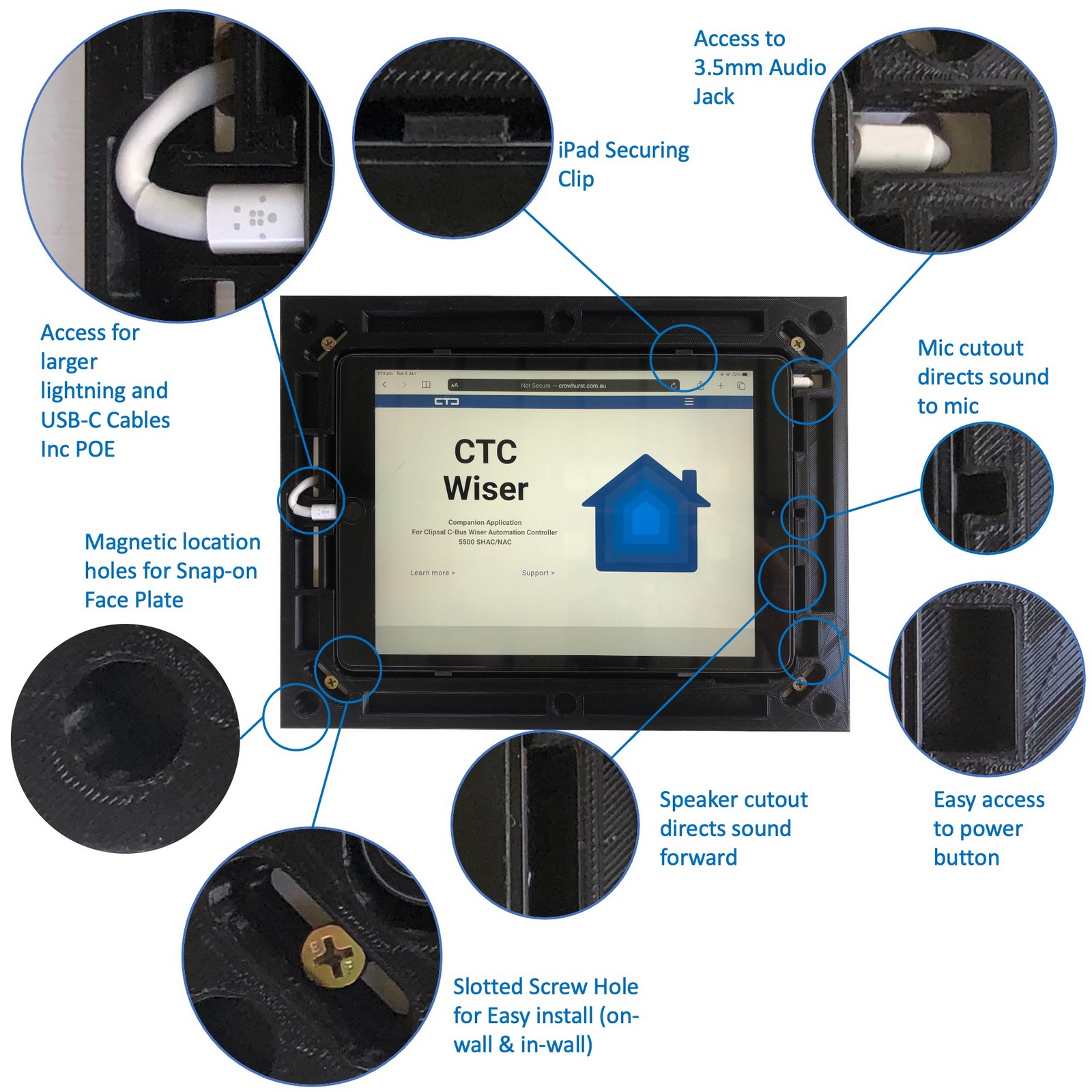 With slotted screw holes, snap in iPad clips, magnetic snap on face plates and access for larger lighnting and USB-C cables. CTC Wall Mount makes for an easy installation.